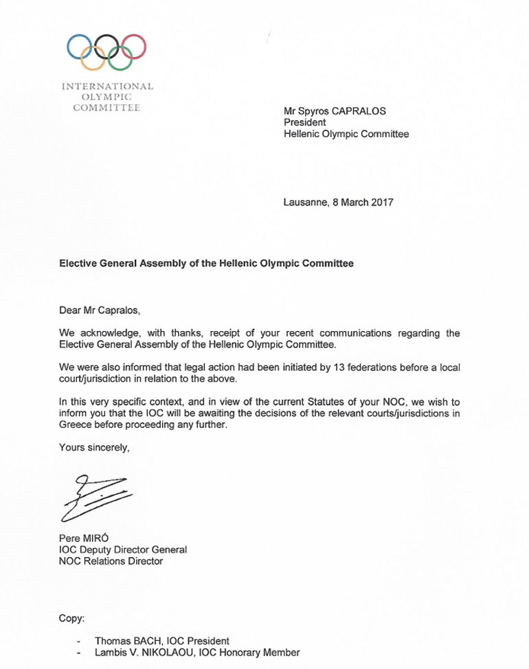 Η Διεθνής Ολυμπιακή Επιτροπή διά του γενικού διευθυντή της Pere Miro δεν αναγνωρίζει το αποτέλεσμα των έτσι κι αλλιώς προβληματικών εκλογών στην Εθνική Ολυμπιακή Επιτροπή, που ανέδειξε οριακά και με πολλά ερωτήματα ως Έλληνα «Αθάνατο» τον Σπύρο Καπράλο.