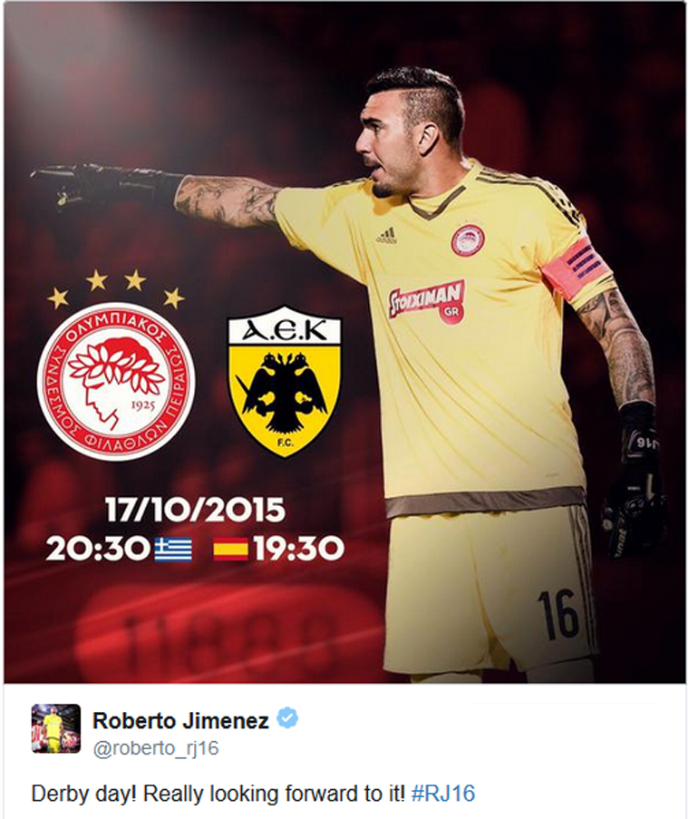 «Ημέρα ντέρμπι. Ανυπομονώ για αυτό!», έγραψε στο Twitter ο Ισπανός γκολκίπερ.