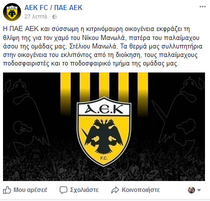 «Η ΠΑΕ ΑΕΚ και σύσσωμη η κιτρινόμαυρη οικογένεια εκφράζει τη θλίψη της για τον χαμό του Νίκου Μανωλά, πατέρα του παλαίμαχου άσου της ομάδας μας, Στέλιου Μανωλά. Τα θερμά μας συλλυπητήρια στην οικογένεια του εκλιπόντος από τη διοίκηση, τους παλαίμαχους ποδοσφαιριστές και το ποδοσφαιρικό τμήμα της ομάδας μας».