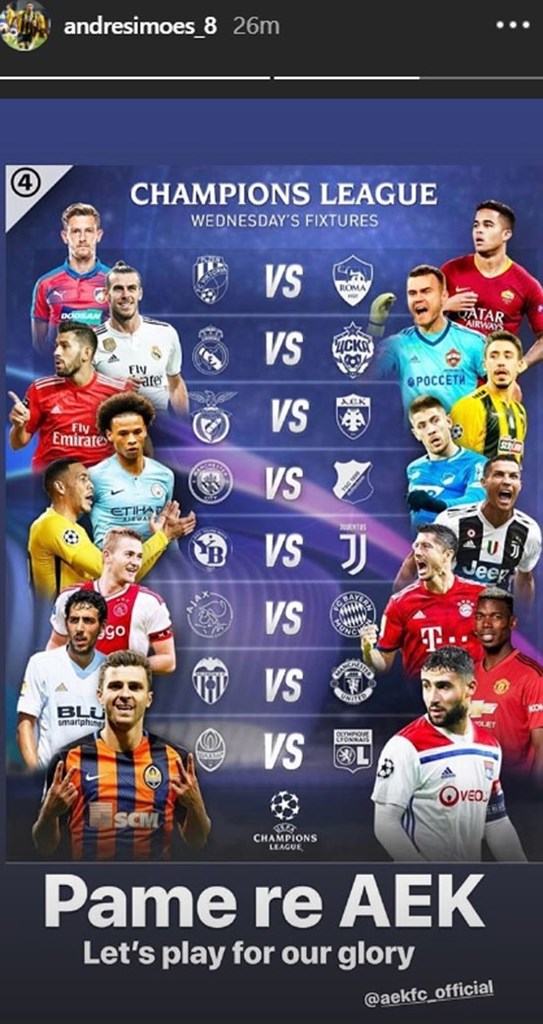 Ο Αντρέ Σιμόες, περί ου ο λόγος, μέσω instagram έστειλε το δικό του μήνυμα για το αποψινό ματς της Ένωσης κόντρα στην Μπενφίκα, που θα διεξαχθεί στη Λισαβόνα, στο πλαίσιο της τελευταίας αγωνιστικής των ομίλων του Τσάμπιονς Λιγκ, αναφέροντας χαρακτηριστικά: «Ας παίξουμε για τη δόξα μας. Πάμε ρε ΑΕΚ».