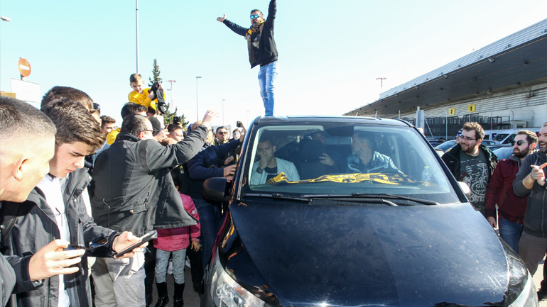 Συγκεκριμένα περίπου 200 φίλοι της «Ένωσης» βρέθηκαν στο αεροδρόμιο, προκειμένου να υποδεχτούν τον Αργεντίνο άσο, ο οποίος με προσωπικές ενέργειες του Δημήτρη Μελισσανίδη θα ντυθεί εκ νέου στα «κιτρινόμαυρα».