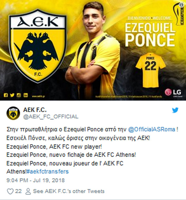 «Η ΠΑΕ ΑΕΚ ανακοινώνει τη συμφωνία της με την AS Roma για τον δανεισμό του Αργεντινού επιθετικού, Εζεκιέλ Πόνσε για τη σεζόν 2018-19 με δικαίωμα επέκτασης της συμφωνίας και αγοράς του ποδοσφαιριστή τον Ιούνιο του 2019.