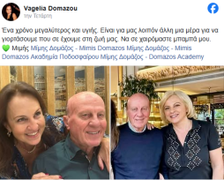 Ανάρτηση έκανε και η Πόπη Δομάζου, η οποία ήταν μαζί του και όταν κατέρρευσε στην είσοδο γνωστού διαγνωστικού κέντρου. «Χρόνια σου πολλά !!! Μίμης Δομάζος – Mimis Domazos. Να είσαι πάντα χαμογελαστός, γεμάτος πείσμα, πάθος και δύναμη. Είναι μια απέραντη αγάπη τελικά όλο αυτό», οι δημόσιες ευχές της