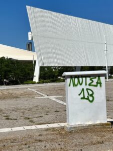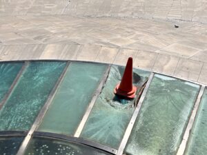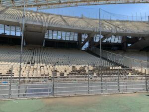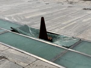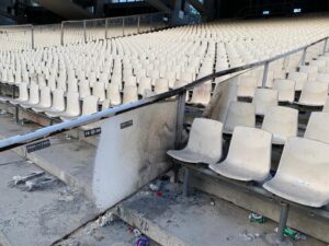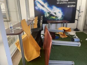 – Δημοσιογραφικά θεωρεία με σπασμένα plexiglass και καρέκλες
