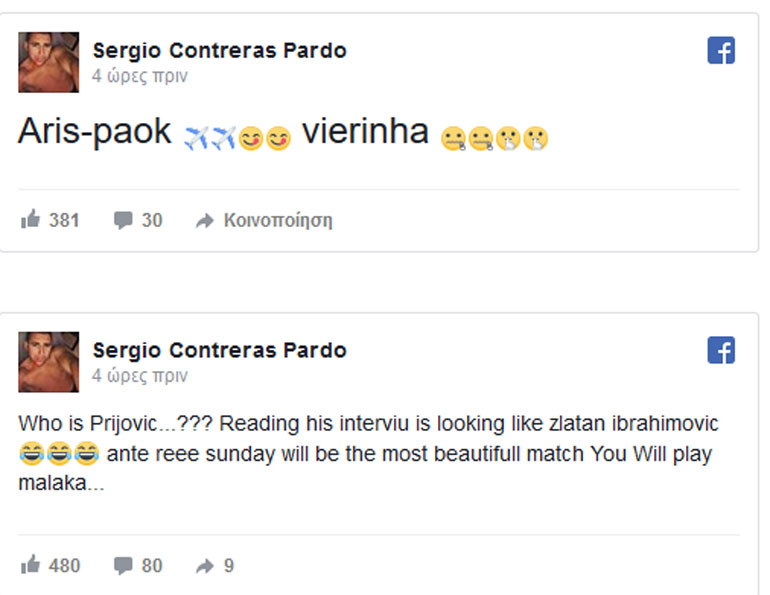 Πρώτα λοιπόν πόσταρε στο Facebook εικονίδια με αεροπλάνα (θέλοντας να δείξει ότι θα βρεθεί στη Θεσσαλονίκη για να παρακολουθήσει το παιχνίδι) και με τον ίδιο τρόπο κάλεσε τον αρχηγό του «δικεφάλου» να… σωπάσει.