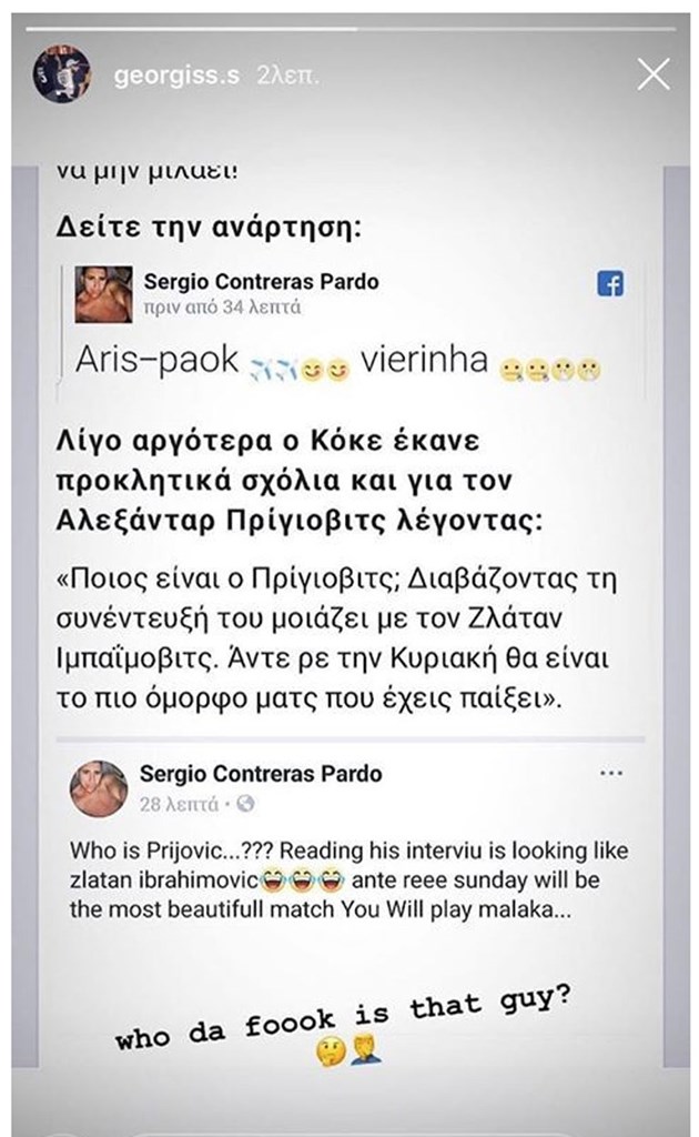 Αναφερόμενος, δε, στον Σέρβο επιθετικό σε δεύτερο ποστάρισμά του, έγραψε: «Ποιος είναι ο Πρίγιοβιτς; Διαβάζοντας τη συνέντευξή του, μοιάζει με τον Ζλάταν Ιμπραΐμοβιτς. Άντε ρε, την Κυριακή θα είναι το πιο όμορφο παιχνίδι που θα παίξεις, μ…α».