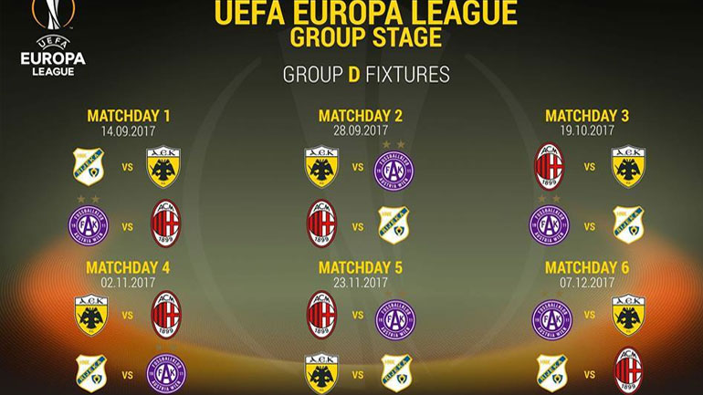 Στην έδρα της Ριέκα θα κάνει πρεμιέρα η ΑΕΚ στον 4ο όμιλο του Europa League, το βράδυ της 14ης Σεπτεμβρίου. Στη συνέχεια υποδέχεται την Αούστρια στο ΟΑΚΑ και ακολουθούν δύο διαδοχικές αναμετρήσεις με τη Μίλαν.
