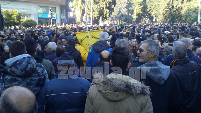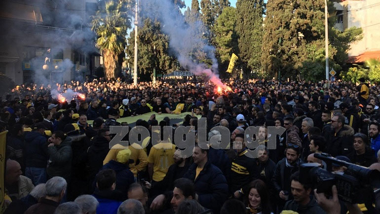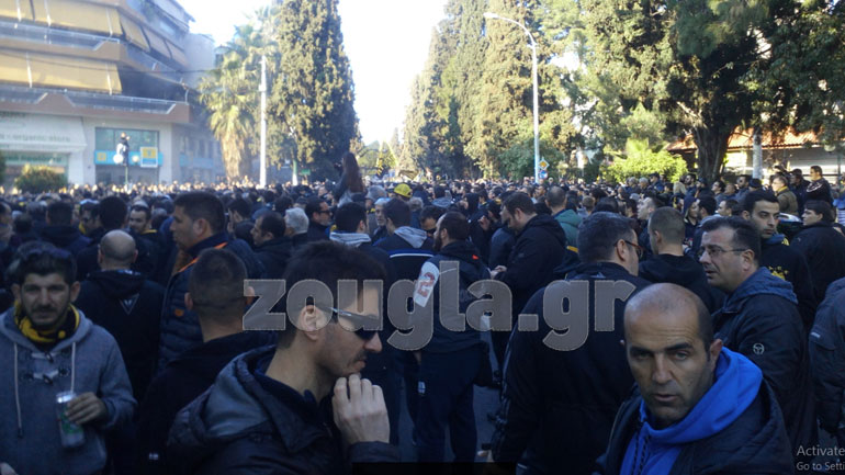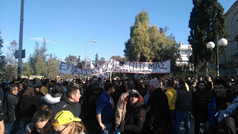 Το συλλαλητήριο που άρχισε στις 4 το απόγευμα με συγκέντρωση στον δρόμο που βρισκόταν η ιστορική «σκεπαστή» κερκίδα του «Νίκος Γκούμας» ολοκληρώθηκε λίγο μετά τις 5 με πορεία προς το ΟΑΚΑ, όπου θα διεξαχθεί το ντέρμπι με τον ΠΑΟΚ.