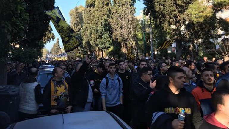 Το συλλαλητήριο που άρχισε στις 4 το απόγευμα με συγκέντρωση στον δρόμο που βρισκόταν η ιστορική «σκεπαστή» κερκίδα του «Νίκος Γκούμας» ολοκληρώθηκε λίγο μετά τις 5 με πορεία προς το ΟΑΚΑ, όπου θα διεξαχθεί το ντέρμπι με τον ΠΑΟΚ.