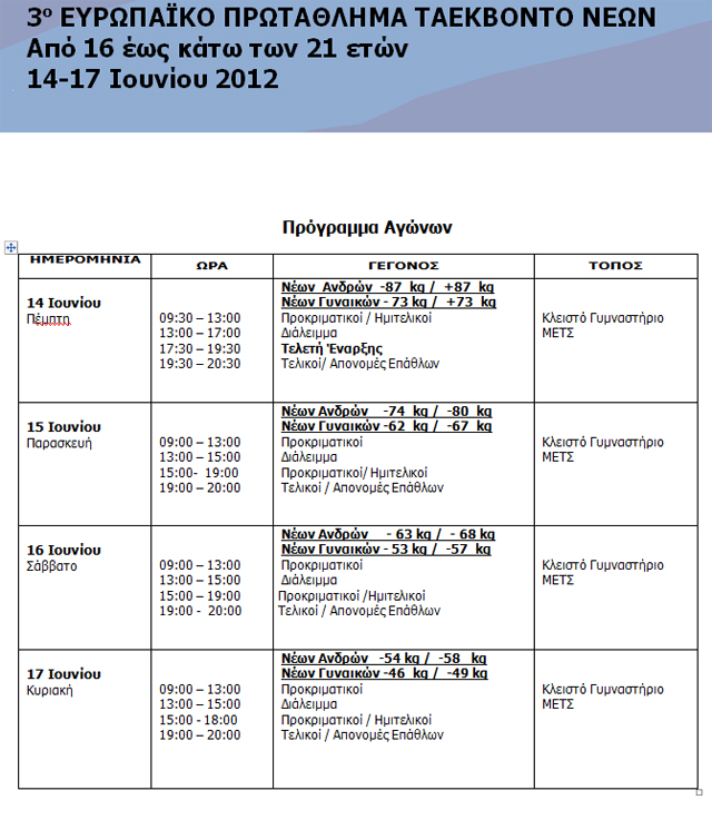 Με την ευκαιρία του 3ου Ευρωπαϊκού Πρωταθλήματος Νέων Taekwondo 2012, που φιλοξενεί η Αθήνα από 14 έως 17 Ιουνίου 2012, στο κλειστό Γήπεδο «Παναγιώτης Γκάζγκας» στο Μετς, πραγματοποιήθηκε την Τρίτη 12 Ιουνίου, στο Πνευματικό Κέντρο του Δήμου Αθηναίων η Συνέντευξη Τύπου που παραχώρησαν η Πρόεδρος του Πολιτισμού, Αθλητισμού & Νεολαίας του Δήμου Αθηναίων (ΟΠΑΝΔΑ) Παναγιώτα Ψαράκη, ο Γενικός Γραμματέας Αθλητισμού Πάνος Μπιτσαξής, ο Προέδρου της Ευρωπαϊκής Ομοσπονδίας Αθανάσιου Πραγαλού, ο Πρόεδρος της Ελληνικής Ομοσπονδίας Ταεκβοντό Νίκος Θωμαΐδης, ο αναπληρωτής Γ.Γ. της Ευρωπαϊκής Ομοσπονδίας Kenneth Schunken και ο Προέδρος της Οργανωτικής Επιτροπής Μιχάλης Φυσεντζίδης.