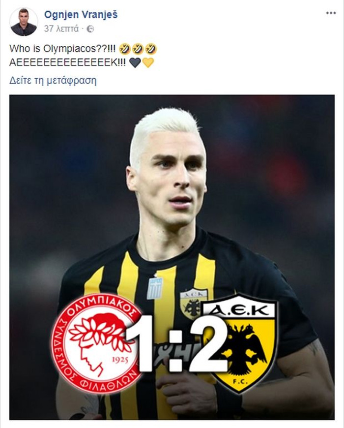 Ο Όγκνιεν Βράνιες μετά το τέλος του ντέρμπι ανάμεσα στον Ολυμπιακό και την ΑΕΚ ανέβασε φωτογραφία του από το ματς το οποίο συνοδευόταν από το τελικό...