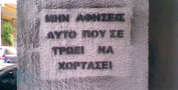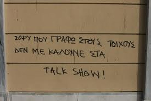 Περιδιαβαίνοντας τα στενά σοκάκια της πόλης, κάπου στο κέντρο της Αθήνας και όχι μόνο, συναντάμε συνθήματα που κάποιος καλλιτέχνης, είτε με υπερβολική δόση χιούμορ, είτε με έντονη δόση κυνισμού, θέλησε να εκφραστεί ελεύθερα, αποτυπώνοντας τη σκέψη του και να μας προβληματίσει…
