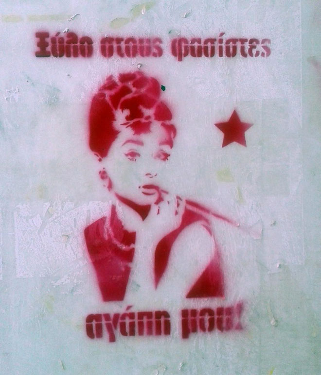 Με αφορμή τη δολοφονία του Παύλου Φύσσα από το μέλος της Χρυσής Αυγής Γιώργο Ρουπακιά, τα social media έχουν βρει πάμπολλους τρόπους να καταδικάσουν την εν ψυχρώ δολοφονία με τα πολιτικά κίνητρα. Μέχρι που επιστράτευσαν το είδωλο του στιλ του Χόλιγουντ Όντρεϊ Χέμπορν, να αναφωνεί: «Ξύλο στους φασίστες αγάπη μου!».