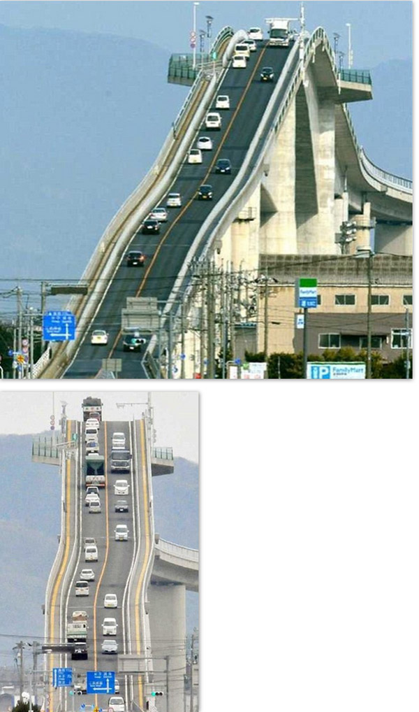 Πάνω από τη λίμνη Νακαούμι, η γέφυρα που συνδέει τις πόλεις Ματσούε και Σακαϊμινάτο έχει κλίση 6,1% από τη μία πλευρά και 5,1% από την άλλη σύμφωνα με την Daily Mail. Και σίγουρα μοιάζει περισσότερο με… τρενάκι του τρόμου σε λούνα παρκ.