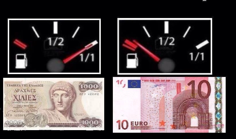 Οι χίλιες δραχμές ήταν 3 περίπου ευρώ. Όμως κάποτε με 1.000 δραχμές γέμιζε σχεδόν το ρεζερβουάρ του αυτοκινήτου, ενώ τώρα με 10 ευρώ δηλαδή 3.400 δραχμές μόλις που ανεβαίνει λίγο η γραμμή της ένδειξης της βενζίνης. Όμως δραχμές δεν υπάρχουν, μόνο ευρώ και με αυτό πορευόμαστε. Η αλλαγή από τη δραχμή στο «σκληρό» ευρώ οπτικοποιημένη και ενδεχομένως εκπεφρασμένη με μια δόση υπερβολής.