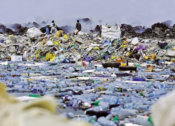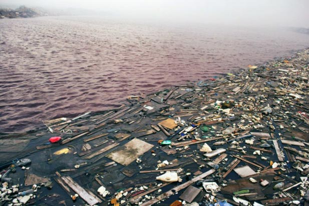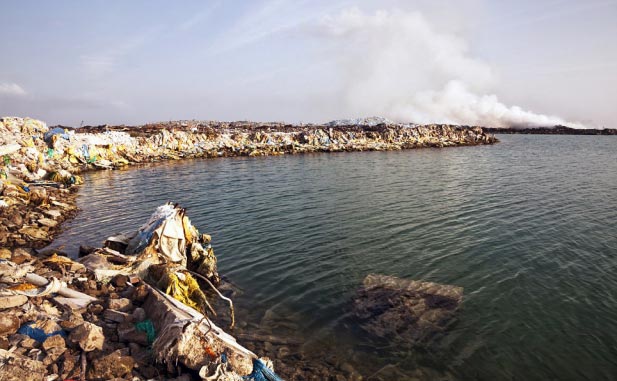 Στοίβες από σκουπίδια φθάνουν μέχρι και το χείλος του λιμανιού. Στο βάθος, ένα άσπρο σύννεφο καπνού δηλητηριάζει την ατμόσφαιρα με διοξείδιο του άνθρακα…