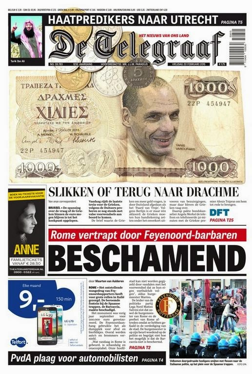 «Καταπιείτε το ή γυρίστε πίσω στη δραχμή», γράφει το σημερινό πρωτοσέλιδο της ολλανδικής εφημερίδας De Telegraaf.