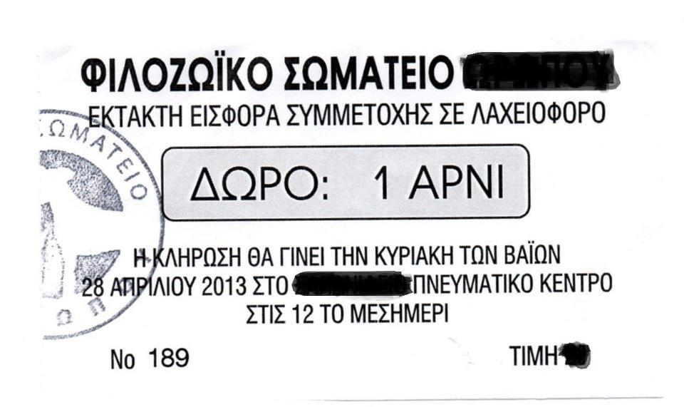 Τα φιλοζωϊκά του αισθήματα δεν φαίνεται να ήταν έντονα, αφού το συγκεκριμένο σωματείο για να εισπράξει τον οβολό των πολιτών αποφάσισε να κληρώσει σε λαχειοφόρο ένα αρνί.