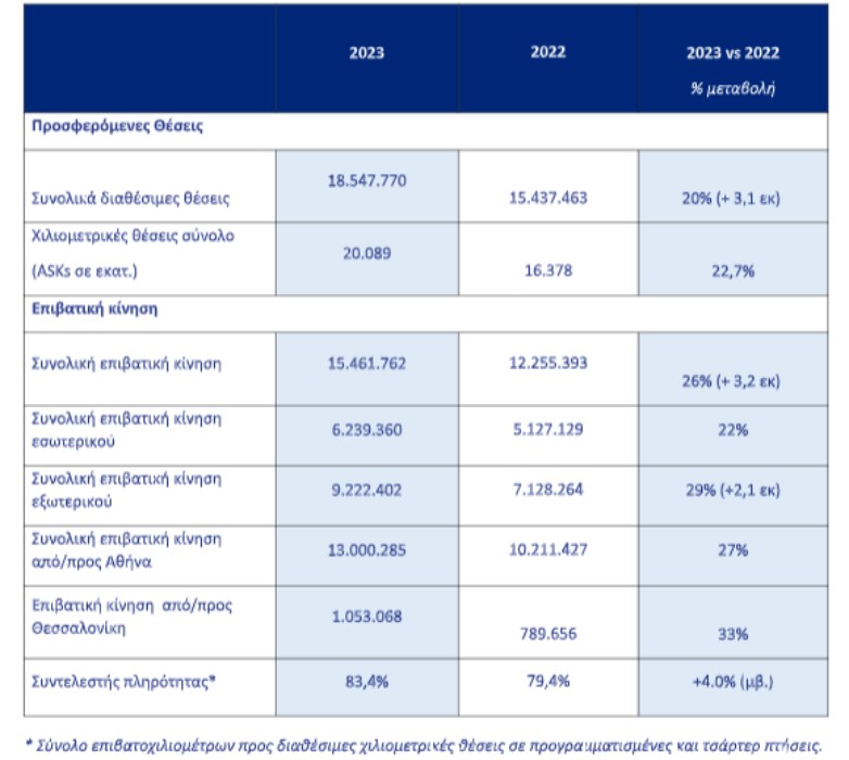 Νέοι προορισμοί, όπως το Ντουμπάι, το Ίνσμπρουκ και η Μπρατισλάβα, αλλά και η διατήρηση θερινών δρομολογίων (από την Αθήνα προς το Μπρίστολ, τη Μάλαγα, το Μπιλμπάο, το Ταλίν, τη Ρίγα, την Τυνησία, αλλά και προς τη Βαρκελώνη από τη Θεσσαλονίκη) κατά τη χειμερινή περίοδο, είχαν ως αποτέλεσμα την αύξηση των χιλιομετρικών θέσεων κατά 23%, ξεπερνώντας τα 20 δις χιλιομετρικές θέσεις σε σχέση με το 2022.