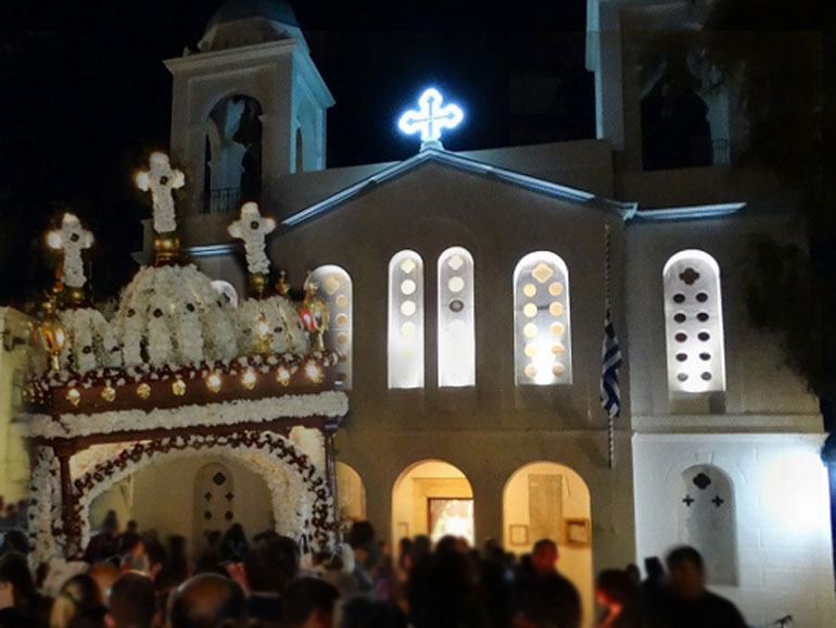 Το Πάσχα στο κυκλαδονήσι με τη θρησκευτική παράδοση δεν θα μπορούσε παρά να είναι γεμάτο συγκινήσεις. Μοναδική είναι η ατμόσφαιρα στη Χώρα το βράδυ της Μεγάλης Παρασκευής, όταν όλοι οι Επιτάφιοι, κατά την περιφορά τους, συγκεντρώνονται στη μαρμάρινη εξέδρα στην πλατεία Παντανάσσης, όπου ψάλλονται τα Εγκώμια.