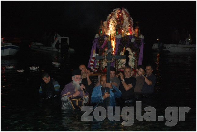 Στη συνέχεια ο Επιτάφιος της ενορίας του Αγίου Νικολάου κατευθύνεται στην παραλία Καλάμια ή Σπιτάλια και μπαίνει στο νερό μαζί με τον παπά και τα εξαπτέρυγα για να τελεστεί δέηση υπέρ των ναυτικών και τρισάγιο στη μνήμη όσων έχασαν τη ζωή τους στη θάλασσα. Στην απέναντι βραχονησίδα έχει τοποθετηθεί μεγάλος φωτεινός σταυρός, ενώ βάρκες με αναμμένους πυρσούς συνοδεύουν την πομπή και ρίχνουν φωτοβολίδες.