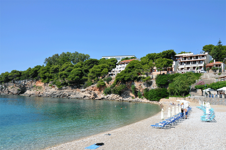 Μία από τις εντυπωσιακότερες παραλίες του νησιού είναι ο Άγιος Δημήτριος, με ολόλευκη άμμο και καταγάλανα νερά. Φημισμένο για το ιδιαίτερο τοπίο του είναι το Κοκκινόκαστρο, με κοκκινωπές αποχρώσεις, άμμο και βότσαλα, θέα στο νησάκι απέναντι, πεύκα και αρχαία τείχη που μαρτυρούν ότι κατοικείται από τον 7ο αιώνα π.Χ. Δημοφιλής είναι και η Χρυσή Μηλιά, οργανωμένη παραλία με ψιλή άμμο, ενώ οι νέοι προτιμούν τον Λεφτό Γιαλό με τα λευκά βότσαλα.