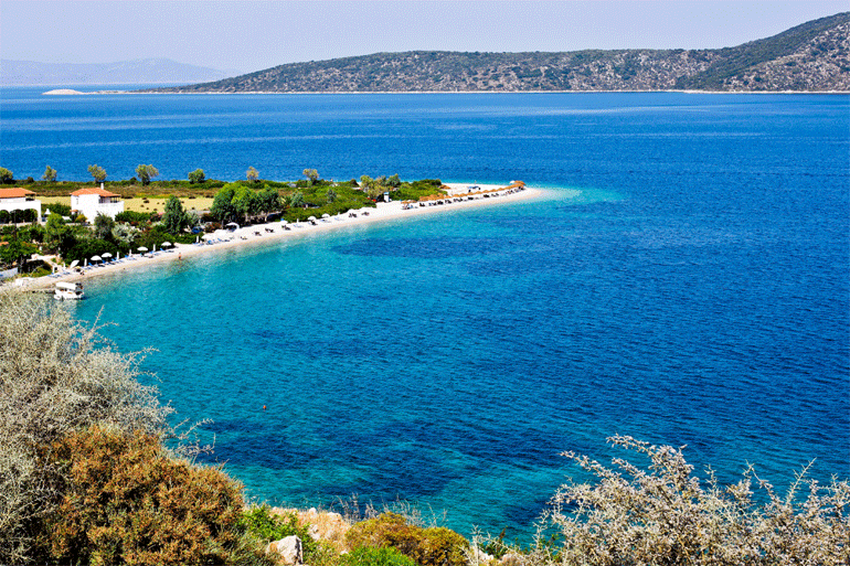 Στην Περιστέρα με τις υπέροχες αμμουδιές. Το νησί, καλυμμένο με μεσογειακή μακία βλάστηση, κρύβει στο βυθό του ένα σημαντικό αρχαίο ναυάγιο.