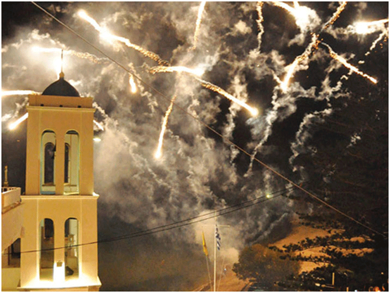 Το βράδυ του Μεγάλου Σαββάτου, σε όποια ενορία και αν βρεθείτε, η Ανάσταση εορτάζεται εντυπωσιακά με πολύχρωμα πυροτεχνήματα και κροτίδες. Αν προτιμάτε Ανάσταση με περισυλλογή και κατάνυξη, επισκεφθείτε κάποιο από τα πανέμορφα μοναστήρια του νησιού, όπως τη Μονή Παναχράντου. Οι εορτασμοί συνεχίζονται στις ταβέρνες με παραδοσιακή μαγειρίτσα και διασκέδαση στα νυχτερινά μαγαζιά.