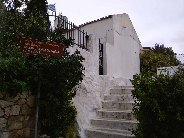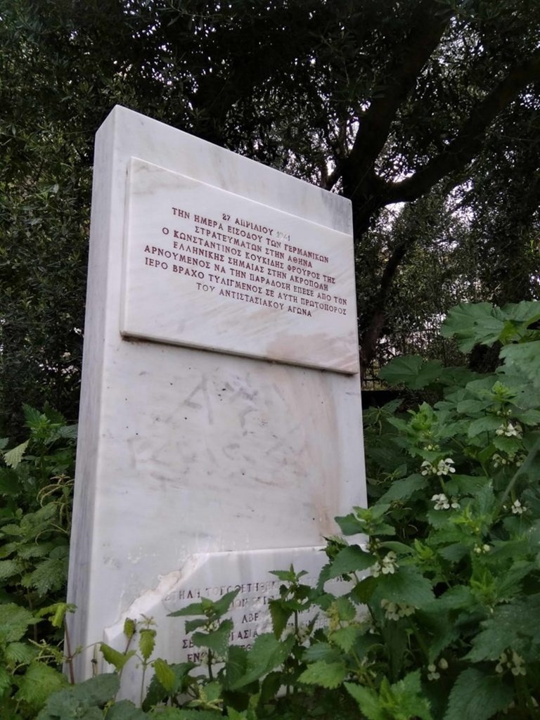 Ο Κωνσταντίνος Κουκίδης ήταν φρουρός της ελληνικής σημαίας στην Ακρόπολη και αρνούμενος να κατεβάσει την εθνική σημαία από τον Ιερό Βράχο της, καθώς τα γερμανικά στρατεύματα επιθυμούσαν να ανεβάσουν τη σημαία με τη σβάστιγκα, έπεσε από τον Ιερό Βράχο τυλιγμένος μέσα της. Προς τιμήν του, ο Δήμος Αθηναίων με την κίνηση “Ενωμένη Εθνική Αντίσταση” στα δεξιά της εκκλησίας του Αγίου Γεωργίου τοποθέτησε το 2000 αναμνηστική ενεπίγραφη πλάκα όπου σε αυτήν αναγράφεται: “ […] ο Κωνσταντίνος Κουκίδης φρουρός της ελληνικής σημαίας στην Ακρόπολη αρνούμενος να την παραδώσει έπεσε από τον ιερό βράχο τυλιγμένος σε αυτή πρωτοπόρος του αντιστασιακού αγώνα”. Το σημείο τοποθέτησης της πλάκας δεν ήταν καθόλου τυχαία επιλογή λόγω του οτι φημολογούνταν εκείνη την εποχή πως στη θανατηφόρα προσγείωσή του, το σώμα του βρέθηκε εντός της εκκλησίας.