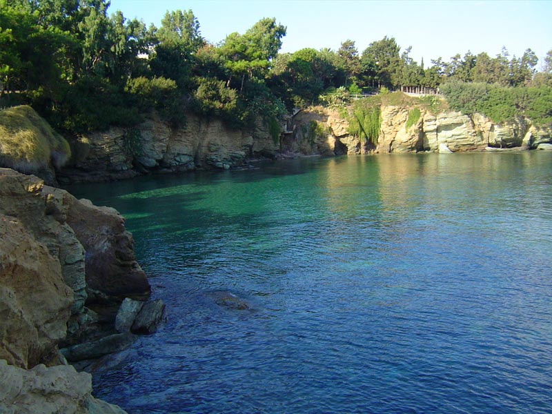 Ο κόλπος της Αγίας Πελαγίας: με την οργανωμένη προστατευμένη από τους βοριάδες παραλία και τα οργανωμένα καταδυτικά κέντρα.