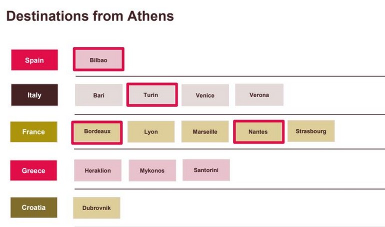 Ακόμη, ξεκινά πέντε νέες πτήσεις για : Ηράκλειο – Ναντ, Μύκονος – Ναντ, Καλαμάτα – Βενετία, Σαντορίνη – Τορίνο και Ζάκυνθος – Ναντ. Θα πετάει ακόμη από Κεφαλονιά, Κέρκυρα, Ηράκλειο, Κάρπαθο, Κω, Μύκονο, Πρέβεζα, Ρόδο, Σάμο, Σαντορίνη, Σκιάθο, Θεσσαλονίκη και Ζάκυνθο και θα συνδέει τα παραπάνω ελληνικά αεροδρόμια με την Κροατία, την Γαλλία, την Ιταλία και την Ισπανία.Η Volotea που υπολογίζει αρκετά τη χώρα μας για τη μεταφορά τουριστών κυρίως στα ελληνικά νησιά απασχολεί περισσότερους από 70 εργαζόμενους.