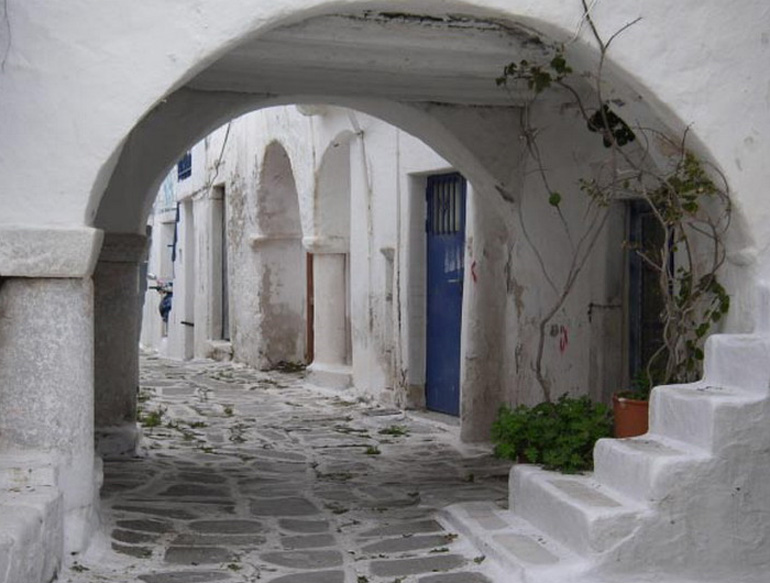 Στις Λεύκες. Το ομορφότερο ίσως χωριό της Πάρου, σε υψόμετρο 250 μ. στην ενδοχώρα του νησιού. Προσφέρεται και για καλό φαγητό.