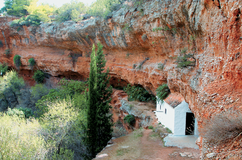 Μια δεύτερη είσοδος, που κατασκευάστηκε από τους μοναχούς, οδηγεί στο εσωτερικό της σπηλιάς, όπου βρίσκονται οι δύο σκαλιστές εκκλησίες, μια πέτρινη κολυμπήθρα, μια μικρή δεξαμενή και μια οπή γνωστή ως «Ασκηταριό» από την οποία ανέρχονται με σχοινί οι ασκητές και λέγεται πως εκεί άφησε το σημάδι του το άλογο του Αγίου Γεωργίου.