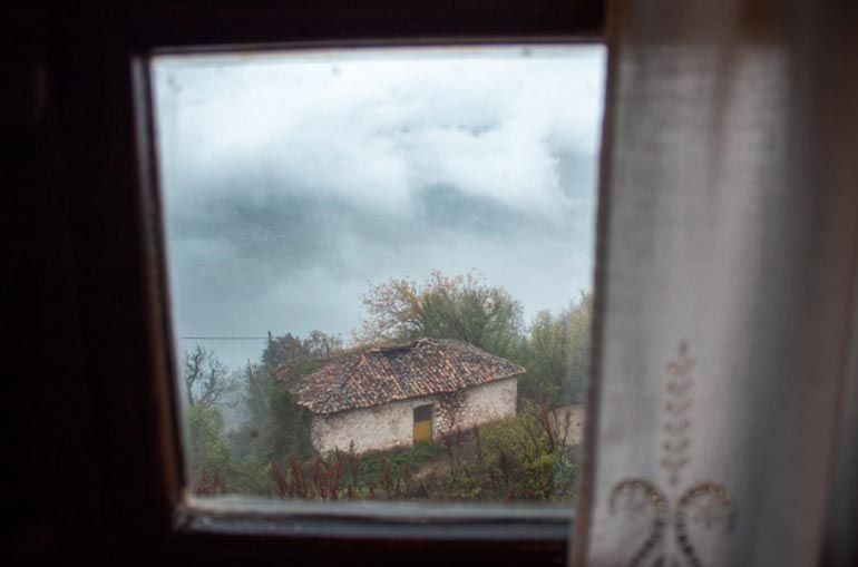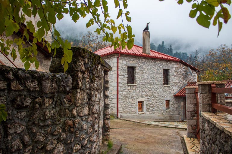 Τη μονοτονία της γκρίζας πέτρας σπάει το πράσινο φόντο του ελατοδάσους, τα κατακόκκινα γεράνια στις αυτοσχέδιες γλάστρες και το κίτρινο των καστανιών. Τράβηξε προς την πλακόστρωτη πλατεία, με πρώτο πλάνο την εκκλησία της Αγίας Παρασκευής.