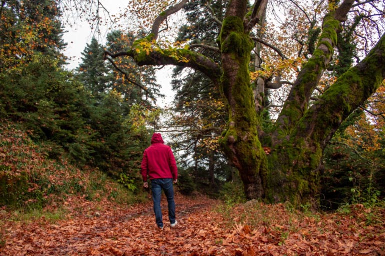 Συνέχισε μέσα από τον δασικό χωματόδρομο για το ξωκκλήσι του Αη Λια. Μια διαδρομή με μοναδικά φυσικά εφέ, το παχύ πέπλο των χρυσοκόκκινων φύλλων από πλατάνια και τα μικρά παράξενα δημιουργήματα της φύσης μας.