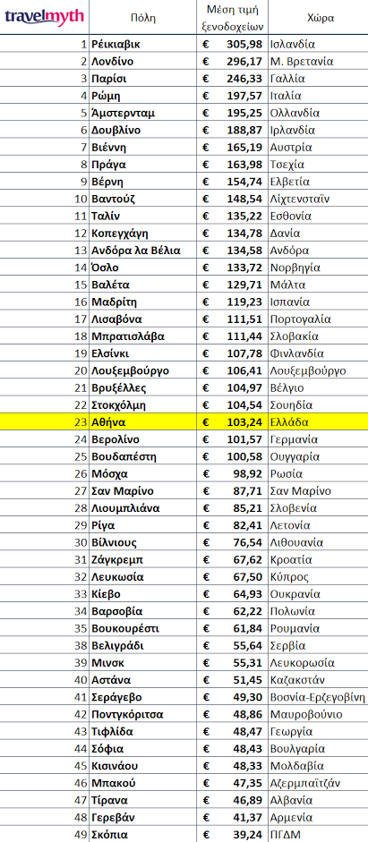 Η Αθήνα βρίσκεται σχεδόν στη μέση της λίστας, στην 23η θέση, με μέση τιμή διανυκτέρευσης ελάχιστα πάνω από τα 100 ευρώ. Είναι από τις φθηνότερες μεγάλες πρωτεύουσες της Ευρώπης, μία θέση πάνω από το Βερολίνο, ενώ χαμηλότερα βρίσκονται η Μόσχα, η Βαρσοβία και το Βουκουρέστι. Στα Βαλκάνια πάντως η Αθήνα είναι η ακριβότερη πρωτεύουσα. Αξιοσημείωτο είναι ότι οι γειτονικές μας πρωτεύουσες βρίσκονται στις χαμηλότερες θέσεις της κατάταξης με τη μέση τιμή των ξενοδοχείων σε Σόφια, Τίρανα και Σκόπια να είναι από 40 έως 50 ευρώ.