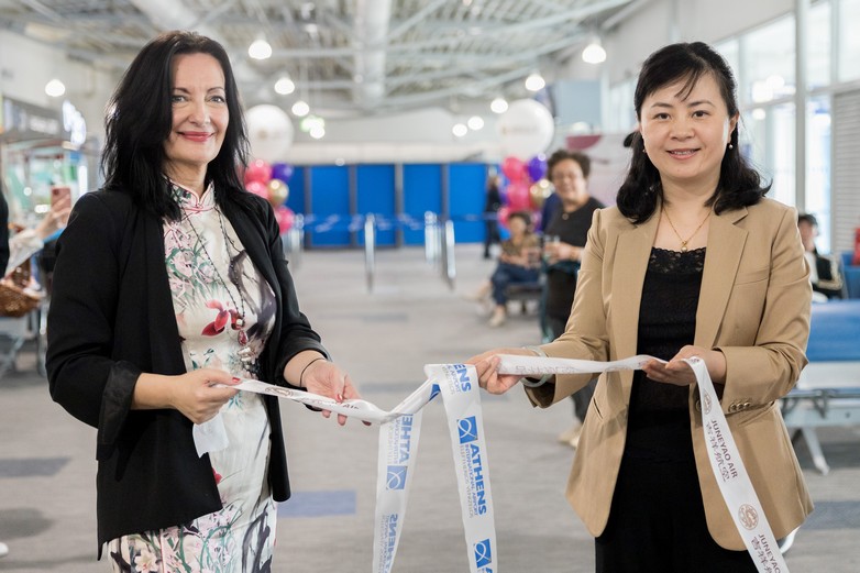 Η κ. Ιωάννα Παπαδοπούλου, Διευθύντρια Επικοινωνίας & Μάρκετινγκ, ΔΑΑ και η κ. Zhou Bin, Director of Services, Juneyao Air