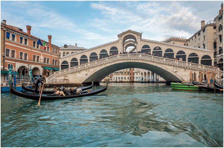 Θα περάσετε κάτω από τη διάσημη Γέφυρα του Ριάλτο (Ponte de Rialto), την πιο εντυπωσιακή από τις γέφυρες του Μεγάλου Καναλιού. Η πρώτη γέφυρα που δεν ήταν ξύλινη ολοκληρώθηκε το 1591 και ενώνει τις περιοχές του Σαν Πόλο και του Σαν Μάρκο. Ο αρχιτέκτονάς της, Αντόνιο ντα Πόντε, κέρδισε την ανάθεση του έργου για το οποίο ήταν υποψήφιοι σπουδαίοι καλλιτέχνες όπως ο Μιχαήλ Άγγελος.