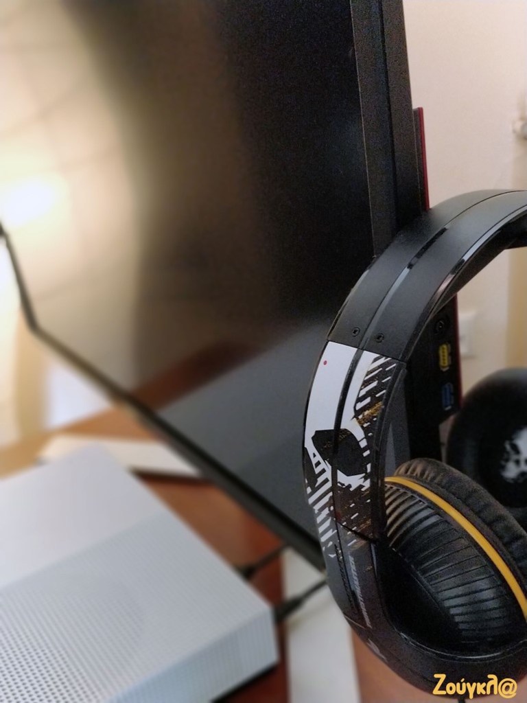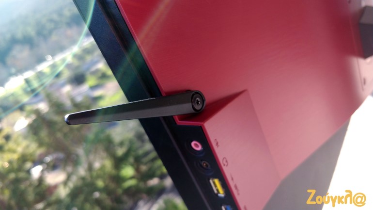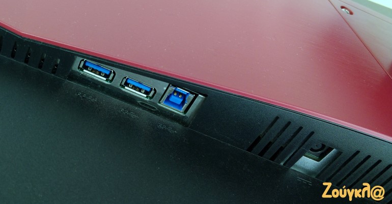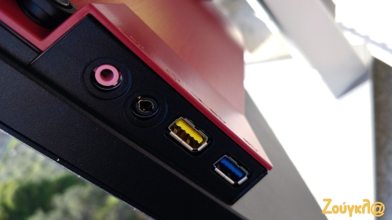 Στη δεξιά πλευρά θα βρείτε τις δύο θύρες USB 3.0, μαζί με θύρα ακουστικών 3.5mm jack, ενώ επίσης υπάρχει ένα πολύ βολικό στήριγμα, που μπορείτε να κρεμάσετε τα ακουστικά σας, το οποίο μπορείτε να ξεδιπλώσετε. Οι display θύρες βρίσκονται στο κάτω μέρος μαζί με τις άλλες δύο USB στα αριστερά, αλλά και στα δεξιά, ενώ τα OSD controls είναι κι αυτά στο κάτω δεξιά μέρος.