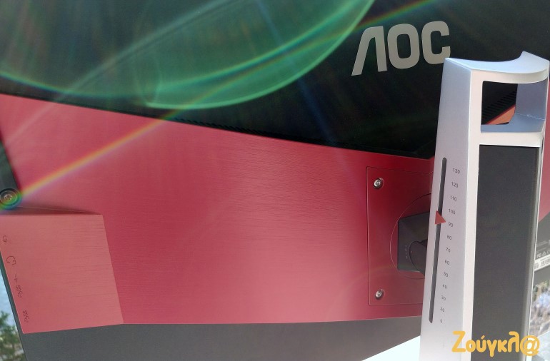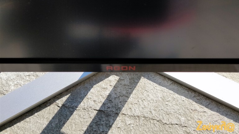 H matte μαύρη επιφάνεια πιάνει την μεγαλύτερη έκταση, ενώ στο πίσω μέρος κάτω από το V κρύβονται οι αεραγωγοί. Παρά την καθαρά gaming αισθητική, η οθόνη άνετα μπορεί να πάρει τη θέση της και σε ένα γραφείο, όπου προφανώς θα αναδεικνύονται οι gaming καταβολές της, όμως δεν θα φαίνεται ξένη, κυρίως λόγω του μινιμαλιστικού σχεδιασμού, στον οποίο αναφερθήκαμε πιο πάνω.