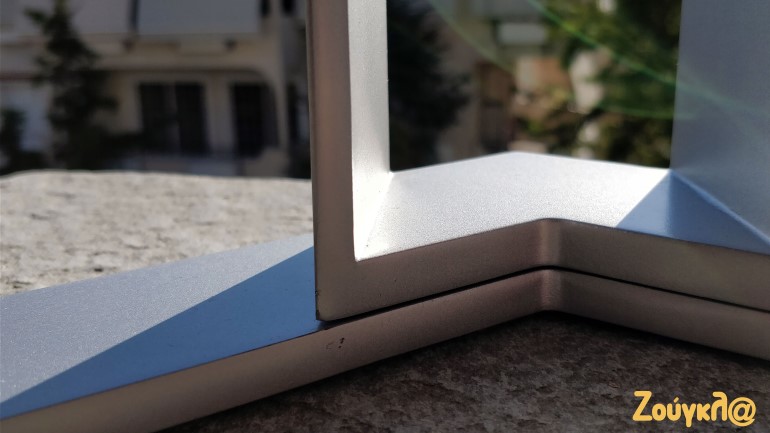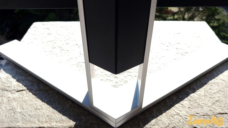 Η κατασκευή από αλουμίνιο δίνει μια εξαιρετικά στιβαρή αίσθηση, η οποία έρχεται να ισχυροποιηθεί από τις σχεδιαστικές γραμμές, τη βάση στήριξης, τη συμβατότητα με VESA βάσεις, αλλά και το πάχος που έχουν τα σημεία στήριξης. Η οθόνη μπορεί να στρίψει στον κάθετο άξονα, στον οριζόντιο, αλλά και να αλλάξετε πανεύκολα το ύψος της σύροντάς την πάνω στο ειδικό κανάλι της βάσης της, όπου μπορείτε να δείτε ή να σημειώσετε την ένδειξη του ύψους. Η εργονομία είναι εξαιρετική.