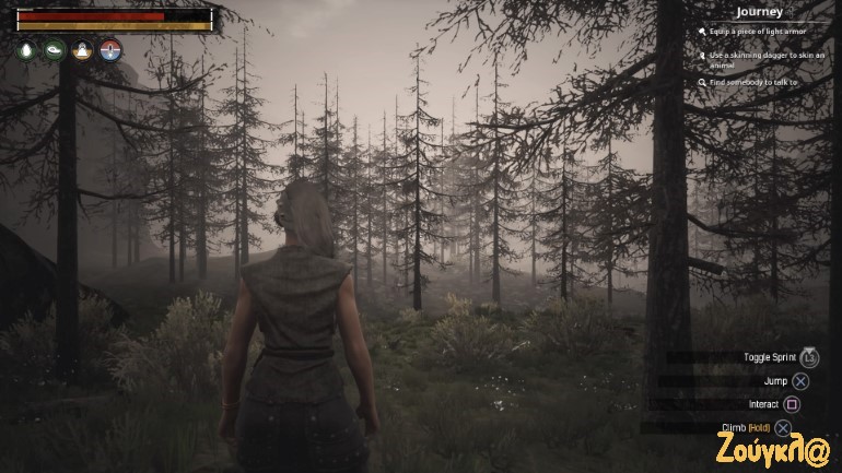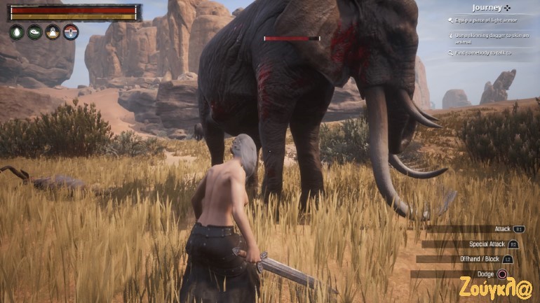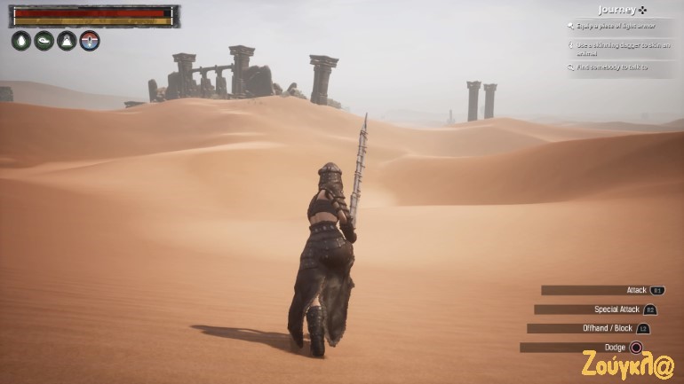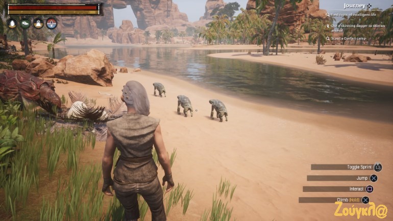 Ξεκινώντας, βλέπουμε πως υπάρχουν μερικοί στόχοι, τους οποίους το παιχνίδι μάς προτρέπει να εκπληρώσουμε. Πρέπει να πιούμε νερό, να φάμε και να δημιουργήσουμε τα πρώτα μας εργαλεία, κερδίζοντας πόντους εμπειρίας παράλληλα. Tutorial δε υπάρχει ούτε για δείγμα. Η μόνη βοήθεια που παίρνουμε, είναι οι προτροπές αυτές που μας δίνουν ένα πλάνο για το πώς θα κινηθούμε, χωρίς όμως πολλές λεπτομέρειες. Επίσης, δεν υπάρχουν quests. Το Conan Exiles είναι ένα sandbox survival παιχνίδι, χωρίς πολύ διάλογο, cut-scenes και σενάριο.