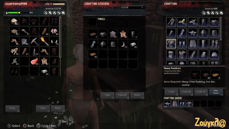 Η δημιουργία υλικών, εργαλείων ή σταθμών εργασίας (π.χ. blacksmith’s bench), απαιτεί μερικές διαδικασίες. Όπως είπαμε, δεν υπάρχει tutorial. Βέβαια, τα συστήματα του Conan Exiles είναι καλοστημένα, οπότε δεν παρουσιάζεται πρόβλημα. Τα ανακαλύπτουμε όλα γρήγορα, καθώς το παιχνίδι επιβραβεύει τους πειραματισμούς. Στην αρχή, όλα είναι εύκολα και δημιουργούνται με απλές συνταγές. Προχωρώντας και ανεβάζοντας levels, αποκτούμε πρόσβαση σε πιο περίπλοκους μηχανισμούς. Μπορούμε να στήσουμε tannery, ώστε να φτιάχνουμε δέρμα από τα ζώα, με το οποίο μετά φτιάχνουμε πανοπλίες στο armory. Για να έχουμε σιδεράδικο, πρέπει πρώτα να έχουμε φούρνο, όπου θα ψήσουμε τούβλα και μπάρες από σίδερο. Ένα από τα πιο πολύπλοκα συστήματα είναι αυτό της δημιουργίας σκλάβων (Thralls) για να δουλεύουν για εμάς. Γενικά, τα διάφορα συστήματα και υλικά συνδέονται μεταξύ τους και έχουμε ένα πολύ βαθύ και ενδιαφέρον σύνολο. Το μόνο πρόβλημα που εντοπίσαμε, ήταν τα δύσχρηστα menus, στην έκδοση για PS4.
