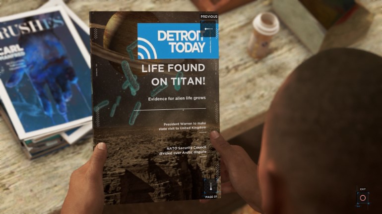Αναμενόμενα, όπως και κάθε τίτλος που σέβεται τον εαυτό του, το Detroit: Become Human περιέχει τα δικά του Collectibles, τα οποία έρχονται στη μορφή περιοδικών. Τα magazines βρίσκονται σε διάφορα σημεία και περιέχουν μικρά κείμενα που θα εμπλουτίσουν την εμπειρία σας με μια πιο σφαιρική εικόνα για την κατάσταση που επικρατεί, όχι μόνο στο Detroit, αλλά σε όλο τον κόσμο. Πέρα από τη “συλλεκτική” τους αξία, μπορούμε να πούμε ότι είναι και από τα πιο ενδιαφέροντα collectibles που έχουμε δει, αφού όντως προσφέρουν πολλές χρήσιμες πληροφορίες.