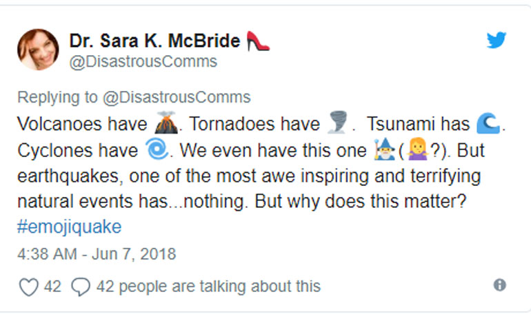 Σήμερα οι άνθρωποι μπορεί να γράψουν στο Twitter στη γλώσσα τους μηνύματα του τύπου «ήταν αυτό σεισμός που μόλις ένιωσα;», αλλά ένα διεθνές emoji -ό,τι πιο κοντινό σε μια διεθνή γλώσσα- θα είναι πιο αποτελεσματικό και ισοδύναμο με ένα παγκόσμιο δίκτυο σεισμογράφων.