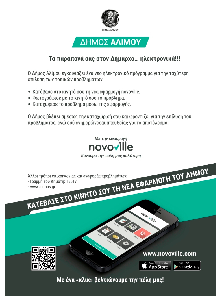 Ο Δήμος Αλίμου εγκαινιάζει την πρωτοποριακή νέα ηλεκτρονική εφαρμογή «novoville» για τον ταχύτερο εντοπισμό των τοπικών προβλημάτων και την άμεση επίλυσή τους.
