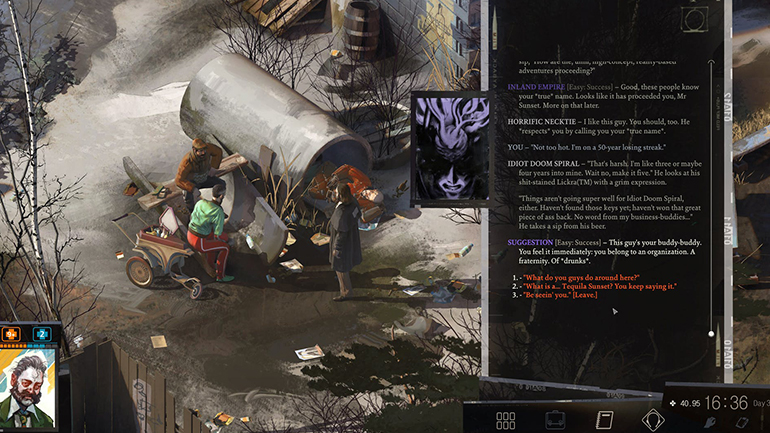 Μάλιστα, η πιθανότητα επιτυχίας φαίνεται στην οθόνη πριν δοκιμάσουμε, ενώ είναι εμφανή και τα ολοκληρωμένα quests που σχετίζονται με το check αυτό, και τα οποία μας δίνουν επιπλέον πιθανότητες να πετύχουμε. Στο σύνολό του είναι ένα πολύ βαθύ σύστημα που συνδυάζει διάφορα ετερόκλητα quests με ιδανικό τρόπο, αλλά η μέθοδος που έχει χρησιμοποιηθεί είναι πολύ «παιχνιδίστικη» και πάει κάπως κόντρα στη γενικότερη απομάκρυνση του Disco Elysium από τα κλασικά χιλιοφορεμένα RPG στοιχεία. Επίσης, αναπόφευκτα προκύπτει το συνηθισμένο κόλπο: είναι δύσκολο το check και υπερβαίνει τις ικανότητες του χαρακτήρα μου; ας του φορέσω όσα ρούχα ανεβάζουν το χαρακτηριστικό που χρειάζεται και ας δοκιμάσω να πετύχω έχοντας κάνει save ακριβώς δίπλα, ώστε να κάνω load και ξανά load μέχρι να πετύχω.
