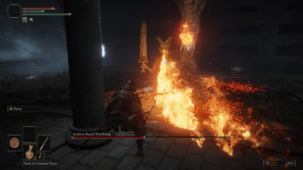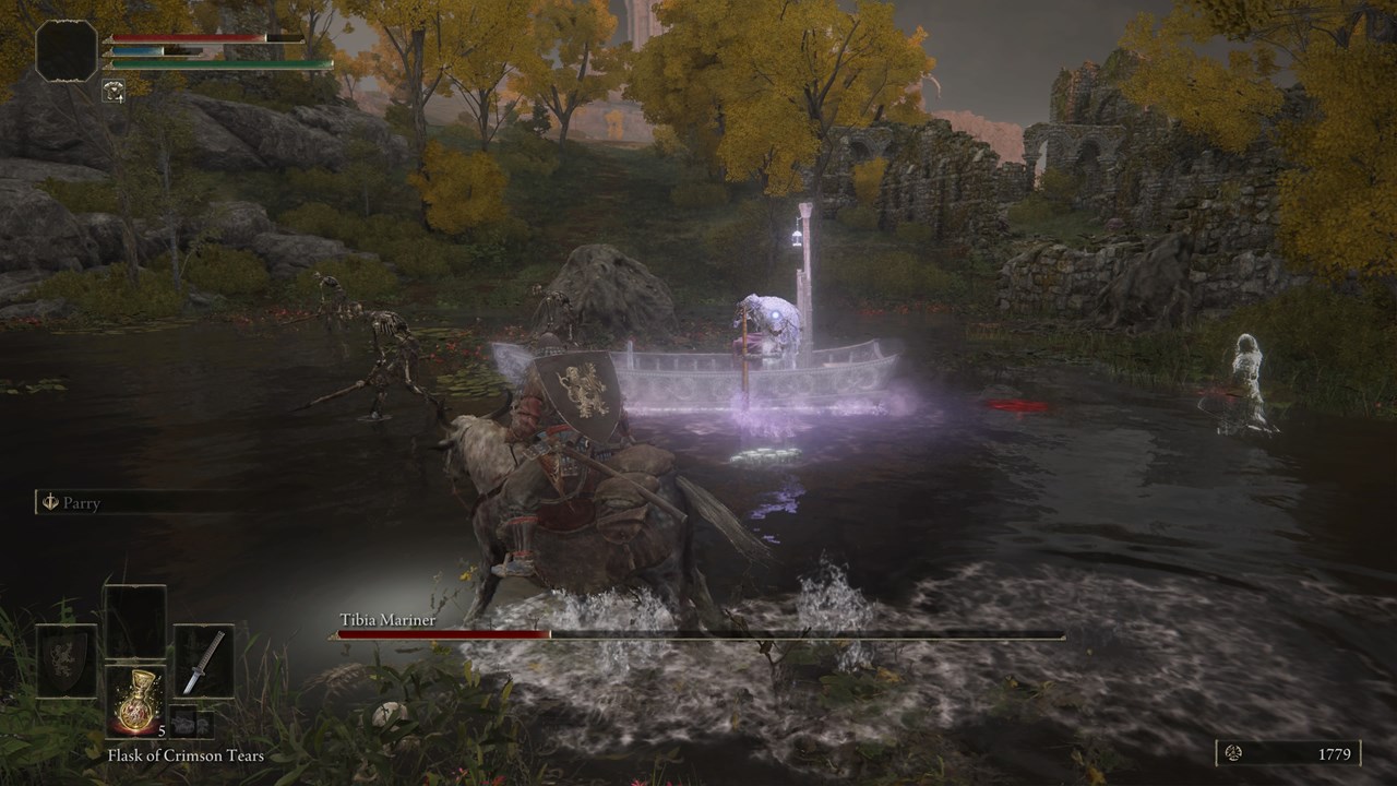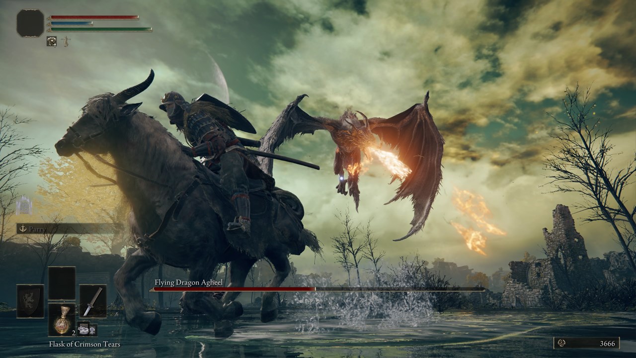 Ο Torrent, όμως, δεν υπάρχει μόνο για να καλύπτετε αποστάσεις, αφού θα είναι σύντροφός σας και στη μάχη. Η έφιππη σύγκρουση είναι κάτι που βλέπουμε για πρώτη φορά σε παιχνίδι της FromSoftware και είναι μια απολαυστική προσθήκη. Πέρα από τις επιλογές που προσφέρει το σύστημα μάχης αυτόνομα (θα μιλήσουμε για αυτές εντός ολίγου), η δυνατότητα να μονομαχήσετε καβάλα στον Torrent δίνει ακόμα περισσότερες νέες διαστάσεις και ταχύτητες στις συγκρούσεις. Σας επιτρέπει να περάσετε τρέχοντας ανάμεσα από ομάδες εχθρών και με μερικά σωστά τοποθετημένα χτυπήματα από τη ράχη του Torrent να μειώσετε τις απειλές και εν τέλει να τις εξαλείψετε. Σας επιτρέπει να πολιορκήσετε το φάντασμα ενός βαρκάρη, που κατά τα άλλα θα σας έστελνε στο τελευταίο checkpoint (site of grace) με ευκολία και έπειτα εσείς θα έπρεπε να τρέξετε να μαζέψετε τα runes σας, το currency του παιχνιδιού με το οποίο αγοράζετε πράγματα, αναβαθμίζετε τα όπλα σας και δυναμώνετε τον χαρακτήρα σας. Και, πάνω από όλα, σας δίνει την ευκαιρία να έρθετε αντιμέτωποι με έναν δράκο σε μια επικών διαστάσεων σύγκρουση στο κέντρο μιας λίμνης, μεταξύ άλλων. Το να σαρώνεις τις περιοχές του Elden Ring μαζί με τον Torrent είναι πιο απολαυστικό και από τα πολύ σύντομα loading screens.