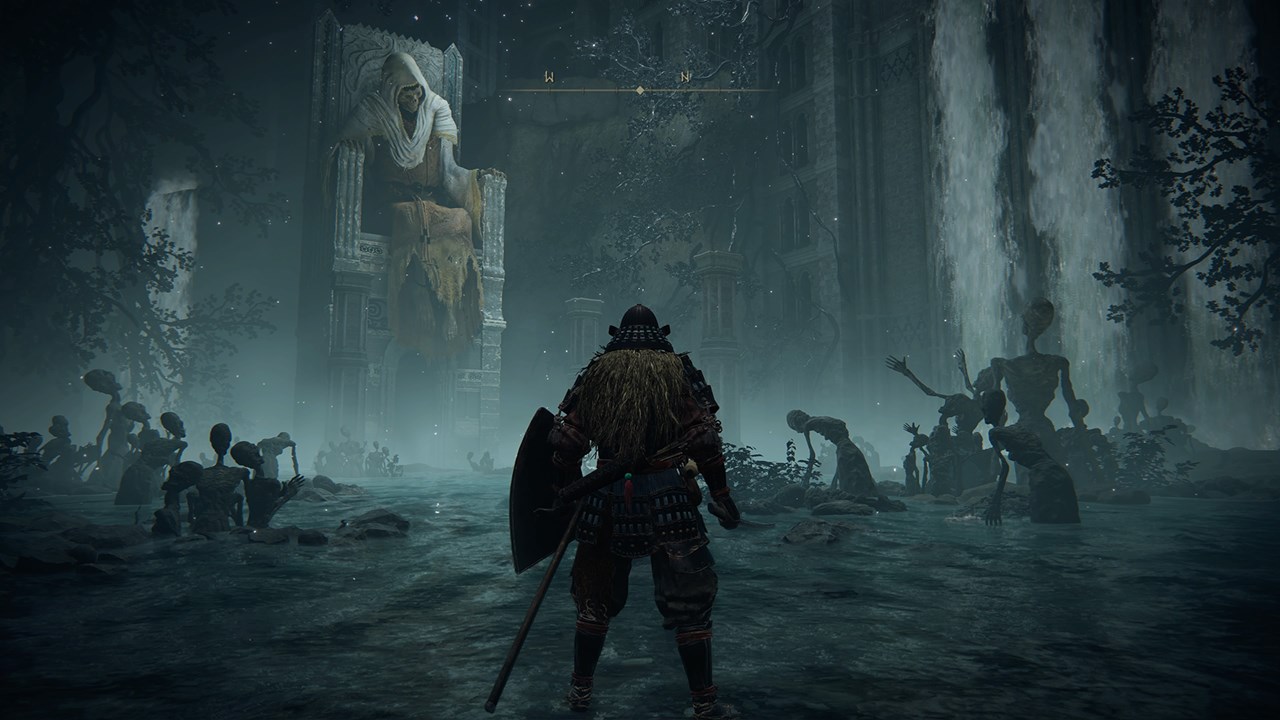 Μπροστά του, λίγα μέτρα μακριά, σε ένα ύψωμα, στέκεται κάποιος. Ο σαμουράι πλησιάζει και ο άγνωστος τον ενημερώνει πως, αν θέλει να έχει μια ελπίδα, τότε θα πρέπει να νικήσει πέντε ημίθεους, τα παιδιά της πρώην βασίλισσας Marika. Με γλαφυρό ύφος του εξηγεί, επίσης, ότι ο σαμουράι πλέον θεωρείται Tarnished. Τι είναι αυτό; Δεν του εξηγεί περαιτέρω και έτσι ο σαμουράι πηδάει από το ύψωμα και αρχίζει να περιπλανιέται, ακολουθώντας ένα χρυσό φως. Σύντομα όμως αρχίζει να ξεμακραίνει από το βασικό μονοπάτι και πάνω σε έναν λόφο βλέπει ένα άγαλμα, που κρατάει ένα κοίλο σκεύος στα χέρια. Ακριβώς από κάτω ανθίζει ένα λουλούδι, το οποίο ο σαμουράι κόβει και κουβαλάει μαζί του στην κορυφή, όπου περιμένει το παράξενο άγαλμα. Από ένστικτο, ακουμπάει το λουλούδι μέσα στο σκεύος και τότε ξεπροβάλει μια απαλή ακτίδα από το λουλούδι που τον οδηγεί σε μια πόρτα, κρυμμένη, λίγο πιο πέρα.