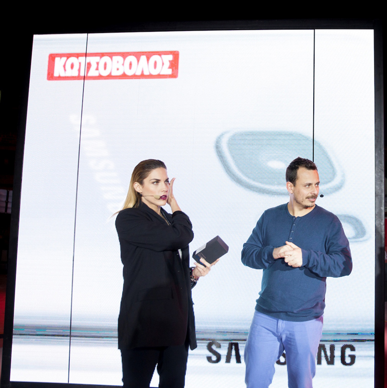 Στην κορύφωση της βραδιάς, ο τρίτος και μεγαλύτερος κύβος, με διάσταση κάθε πλευράς πάνω από 3 μέτρα και κατασκευασμένος εξ’ ολοκλήρου από LED οθόνες, πρόβαλε ένα μοναδικό unboxing video των νέων Samsung Galaxy S7 edge & S7 και στη συνέχεια άνοιξε εντυπωσιακά αποκαλύπτοντας τα νέα κινητά! Οι δύο παρουσιαστές της βραδιάς, Μαντώ Γαστεράτου και Δημήτρης Καρέτσος, κρατώντας στα χέρια τους τα νέα κινητά, μετέφεραν με την αμεσότητά τους στο κοινό όλους τους λόγους που κάνουν τα νέα Samsung Galaxy S7 edge & S7 τα καλύτερα smartphones για όσους αναζητούν τεχνολογία αιχμής!